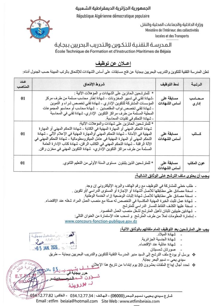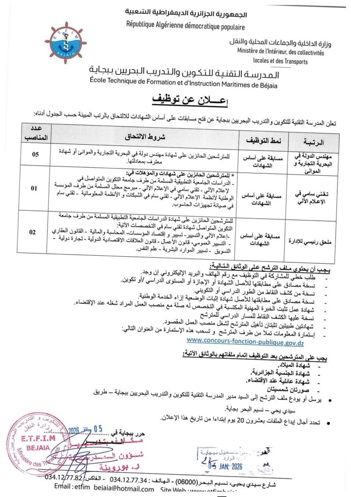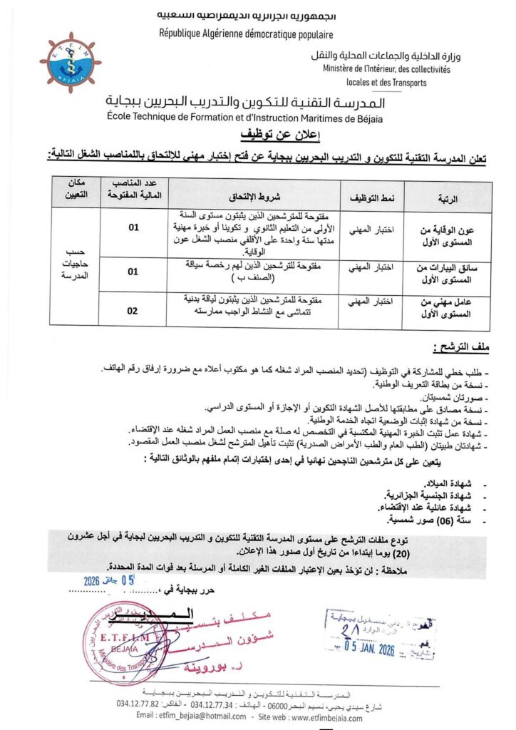 تعلن المدرسة التقنية للتكوين والتدريب البحريين ببجاية عن فتح مسابقات على أساس الشهادات للإلتحاق بالرتب المبينة حسب الجدول أدناه: