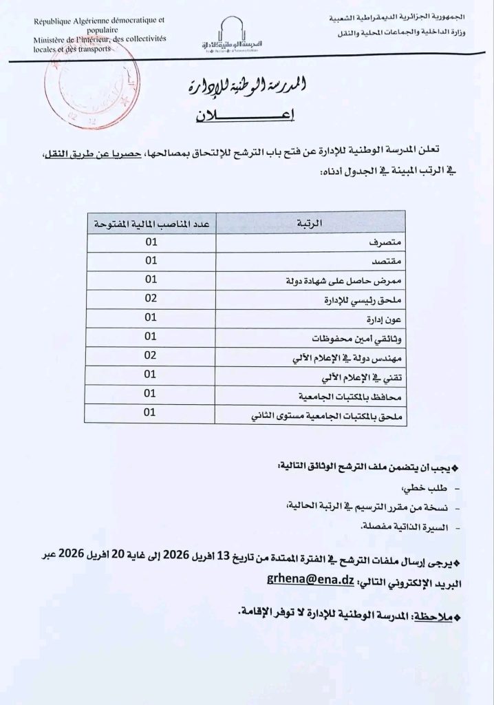 يرجى إرسال ملفات الترشح في الفترة الممتدة من تاريخ 13 أفريل 2026 إلى غاية 20 أفريل 2026 عبر البريد الإلكتروني التالي: grhena@ena.dz