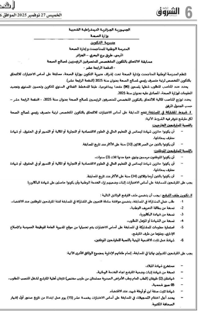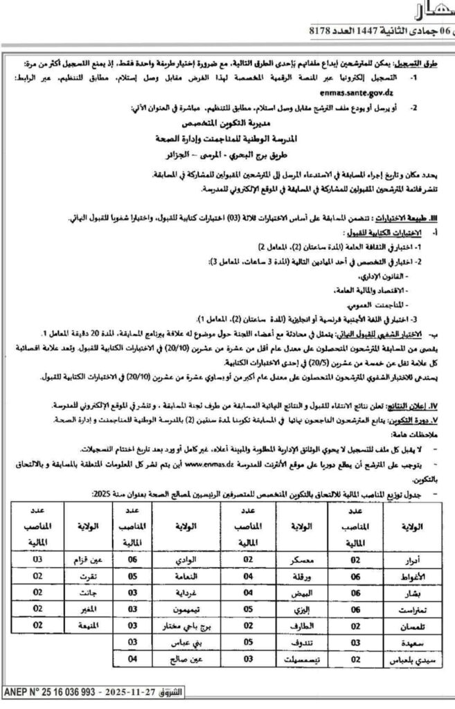 تنظم المدرسة الوطنية للمناجمنت وإدارة الصحة، تحت إشراف مديرية التكوين بوزارة الصحة، مسابقة على أساس الاختبارات للالتحاق بالتكوين المتخصص لرتبة متصرف رئيسي لمصالح الصحة لسنة 2025 (الدفعة 14)، وذلك في حدود: