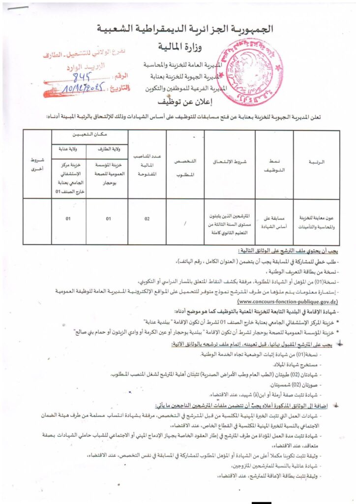 المديرية الجهوية للخزينة بعنابة تعلن عن مسابقة توظيف