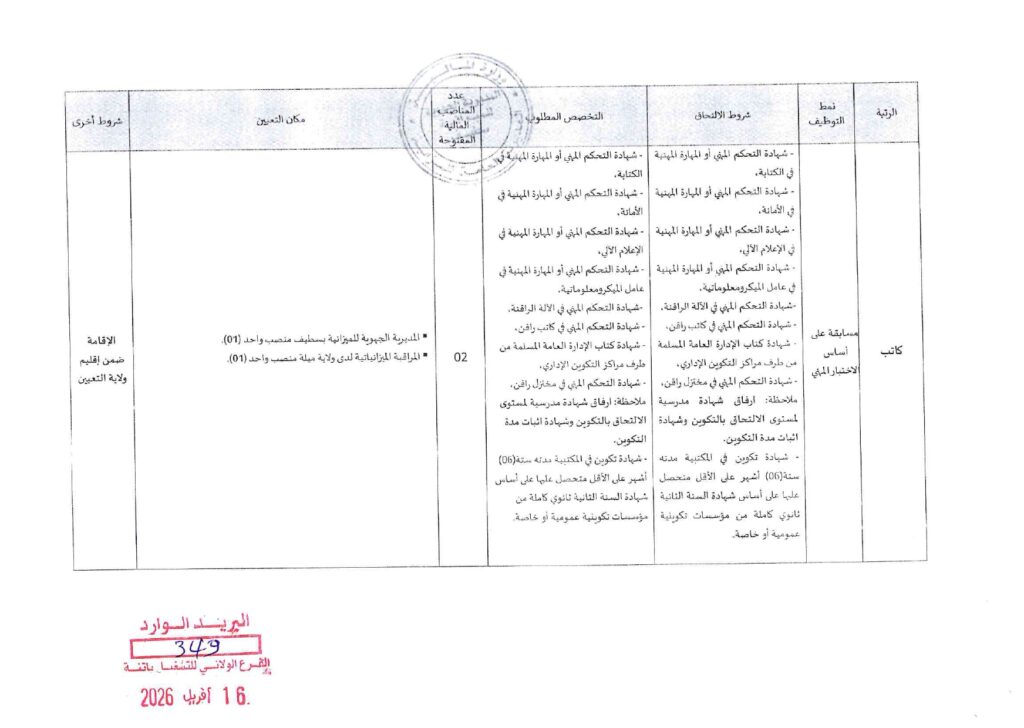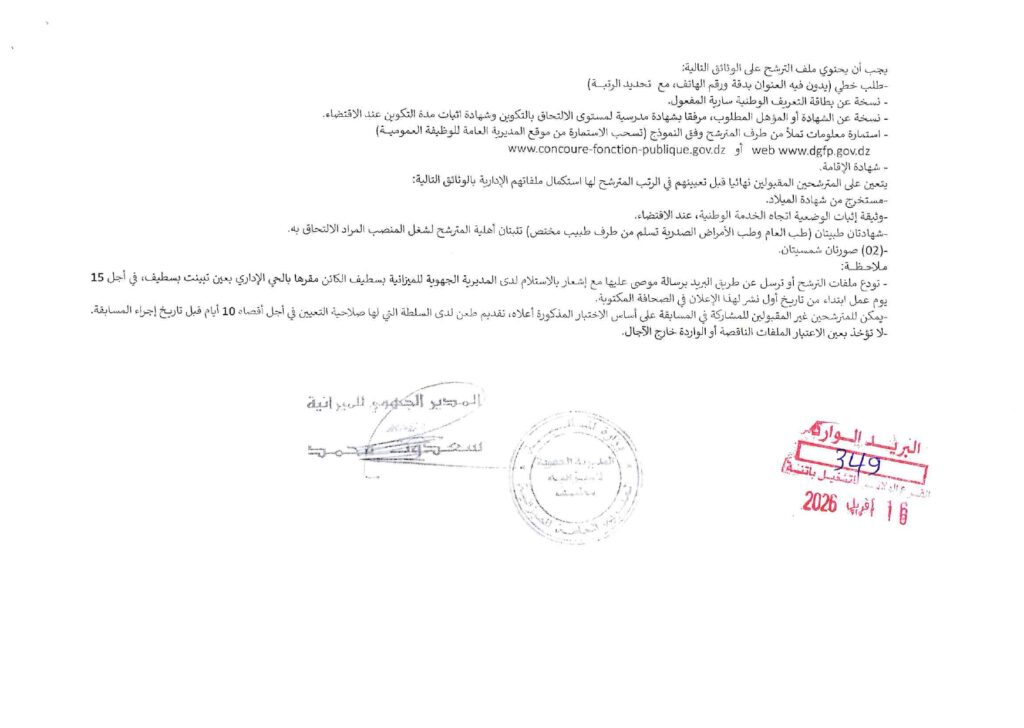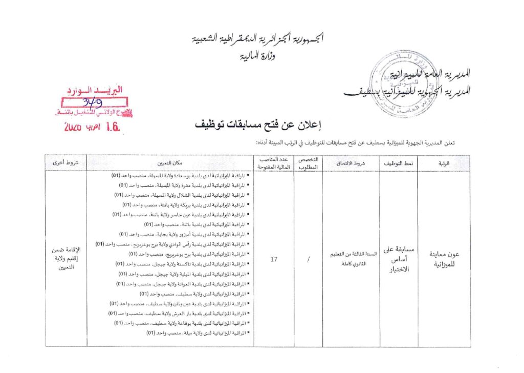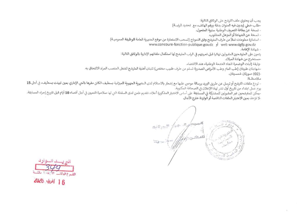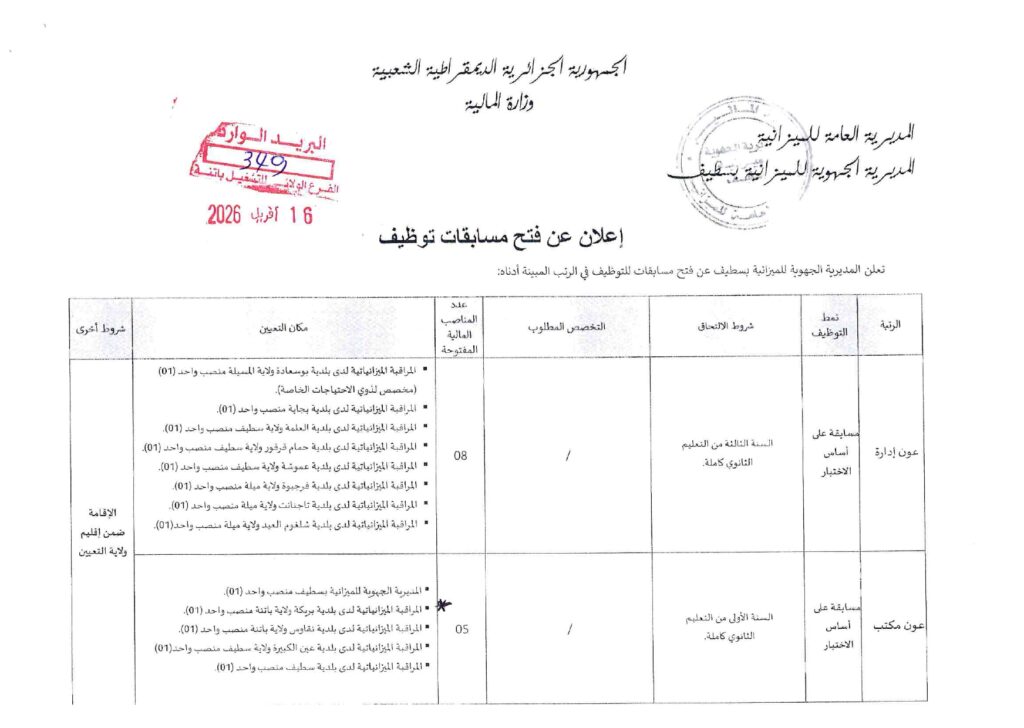 المسابقات الخاص بالمديرية الجهوية للميزانية بسطيف (وزارة المالية الجزائرية)، والمؤرخ بختم البريد الوارد في 16 أفريل 2026: