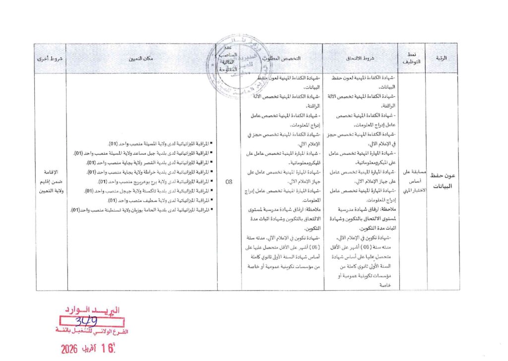 | عون حفظ البيانات | مسابقة على أساس الاختبار | شهادة الكفاءة المهنية لعون حفظ البيانات أو ما يعادلها + السنة الأولى ثانوي كاملة. | 08 | المسيلة، جبل مساعد، القصر، بجاية، برج بوعريريج، جيجل، سطيف، قسنطينة. |