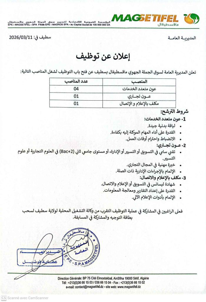 تعلن المديرية العامة لسوق الجملة الجهوي ماقسطيفال بسطيف عن فتح باب التوظيف لشغل المناصب التالية: