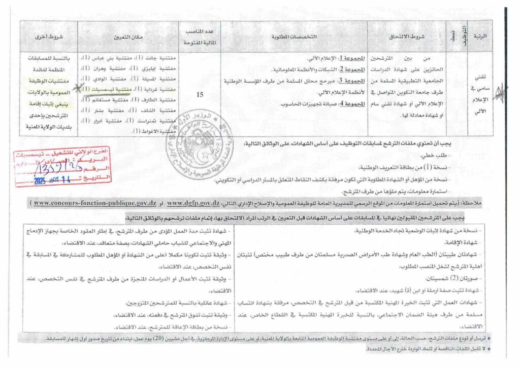 تعلن المديرية العامة للوظيفة العمومية عن فتح مسابقة على أساس الشهادات للتوظيف في رتبة تقني سام في الإعلام الآلي، وذلك لفائدة مفتشيات الوظيفة العمومية عبر عدد من الولايات.