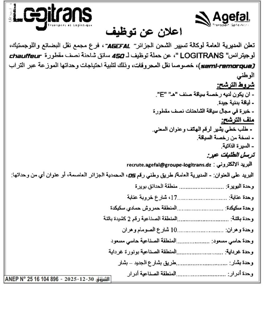 تعلن المديرية العامة لوكالة تسيير الشحن الجزائر (AGEFAL)، فرع مجمع نقل البضائع واللوجستيك LOGITRANS، عن إطلاق حملة توظيف لتدعيم وحداتها الموزعة عبر التراب الوطني، وذلك لتوظيف: