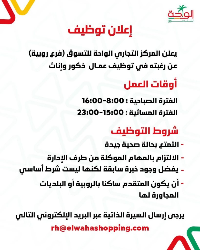 يعلن المركز التجاري الواحة للتسوق (فرع الرويبة) عن رغبته في توظيف عمال ذكور وإناث.