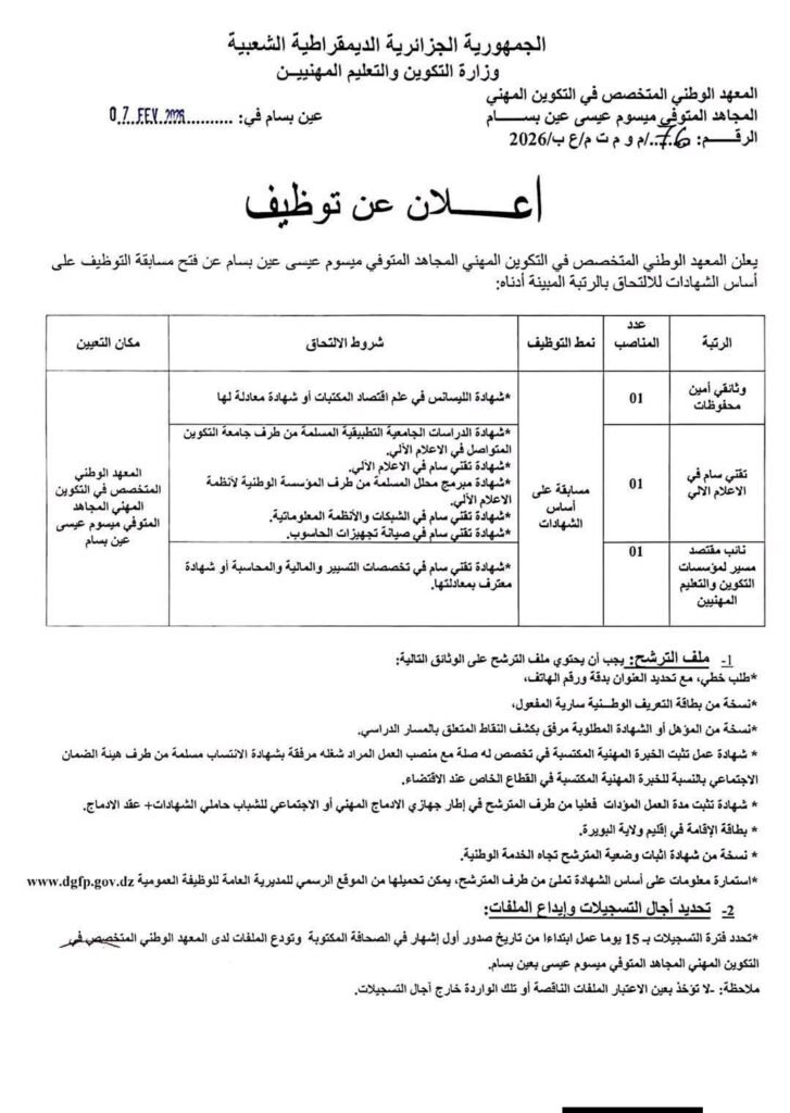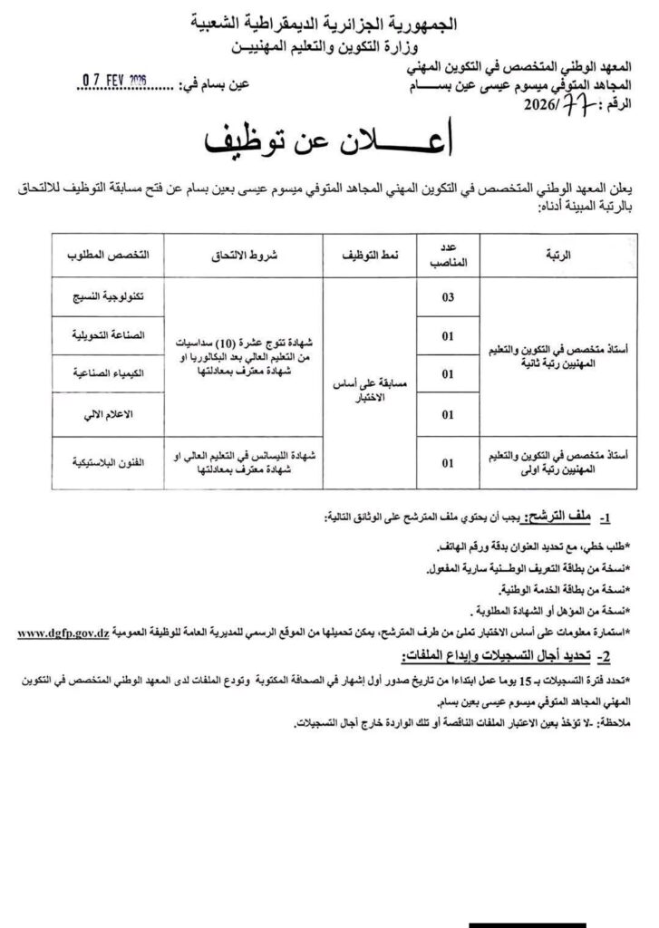للإعلانين الصادرين عن المعهد الوطني المتخصص في التكوين المهني “المجاهد المتوفي ميسوم عيسى” بعين بسام (ولاية البويرة)، والمؤرخين في 07 فيفري 2026.
