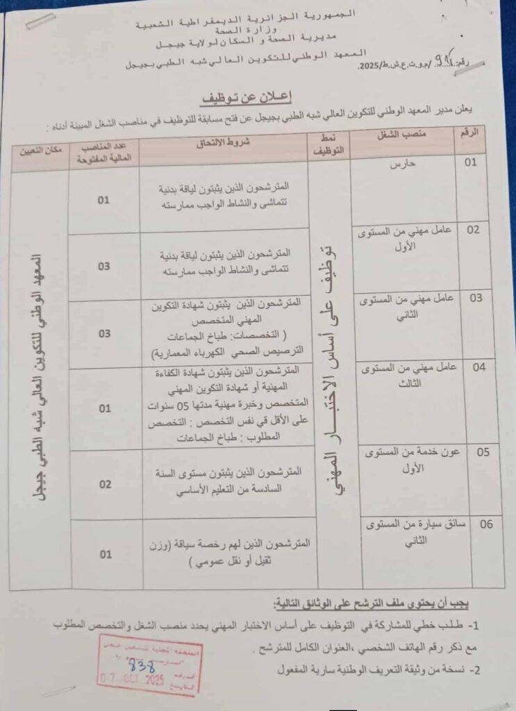يُعلن مدير المعهد الوطني للتكوين العالي شبه الطبي بجيجل عن فتح مسابقة توظيف في مناصب الشغل المبينة أدناه: