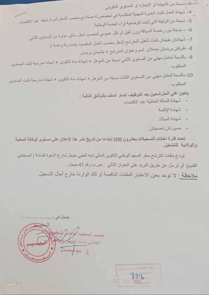 مدة التسجيل: 20 يومًا ابتداءً من تاريخ نشر هذا الإعلان على مستوى الوكالات المحلية والولائية للتشغيل.