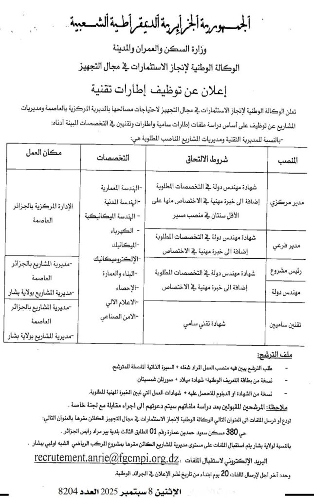 تعلن الوكالة الوطنية لإنجاز الاستثمارات في مجال التجهيز، لتغطية احتياجات مصالحها بالمديرية المركزية بالعاصمة ومديريات المشاريع، عن فتح باب التوظيف على أساس دراسة الملفات لفائدة إطارات سامية، إطارات، وتقنيين في التخصصات المبينة أدناه: