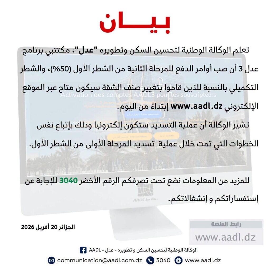 تعلم الوكالة الوطنية لتحسين السكن وتطويره “عدل”، مكتتبي برنامج عدل 3 أن صب أوامر الدفع للمرحلة الثانية من الشطر الأول (50%)، والشطر التكميلي بالنسبة للذين قاموا بتغيير صنف الشقة سيكون متاح عبر الموقع الإلكتروني www.aadl.dz إبتداءً من اليوم.