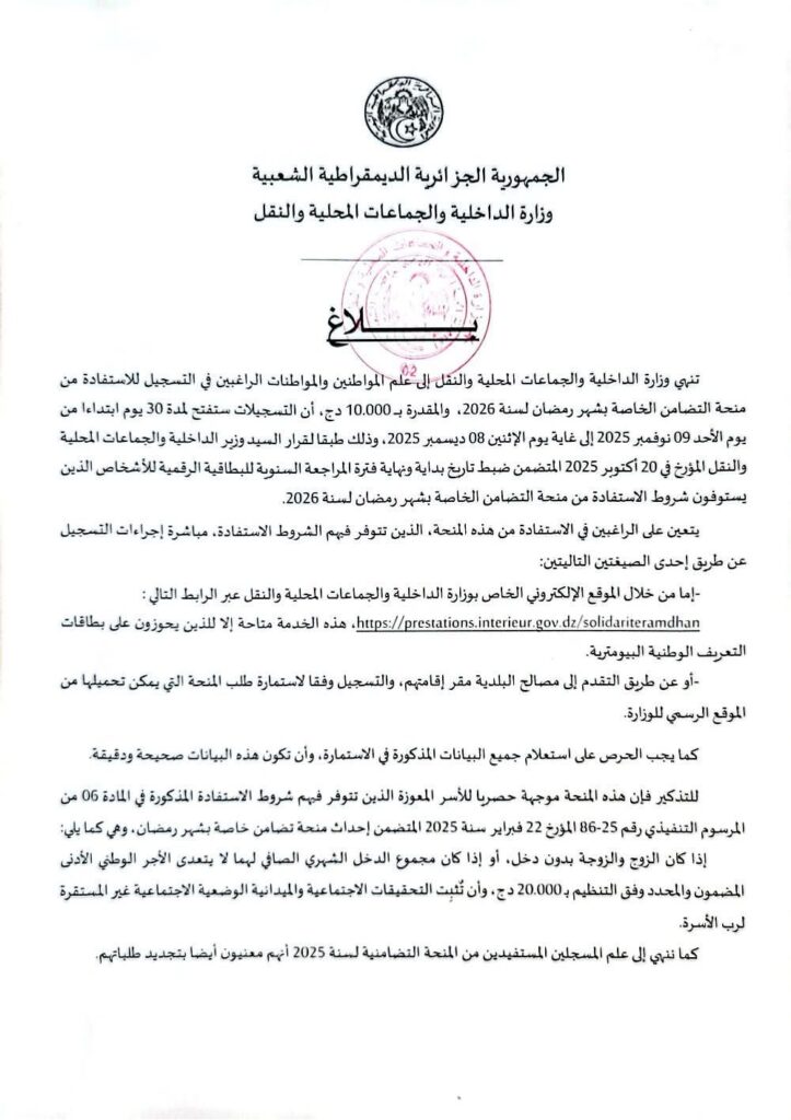 بلاغ بخصوص الإستفادة من الإعانة المالية التضامنية لشهر رمضان لسنة 1447هـ/ 2026م