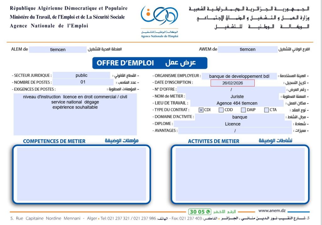 مكان العمل: وكالة 464 تلمسان