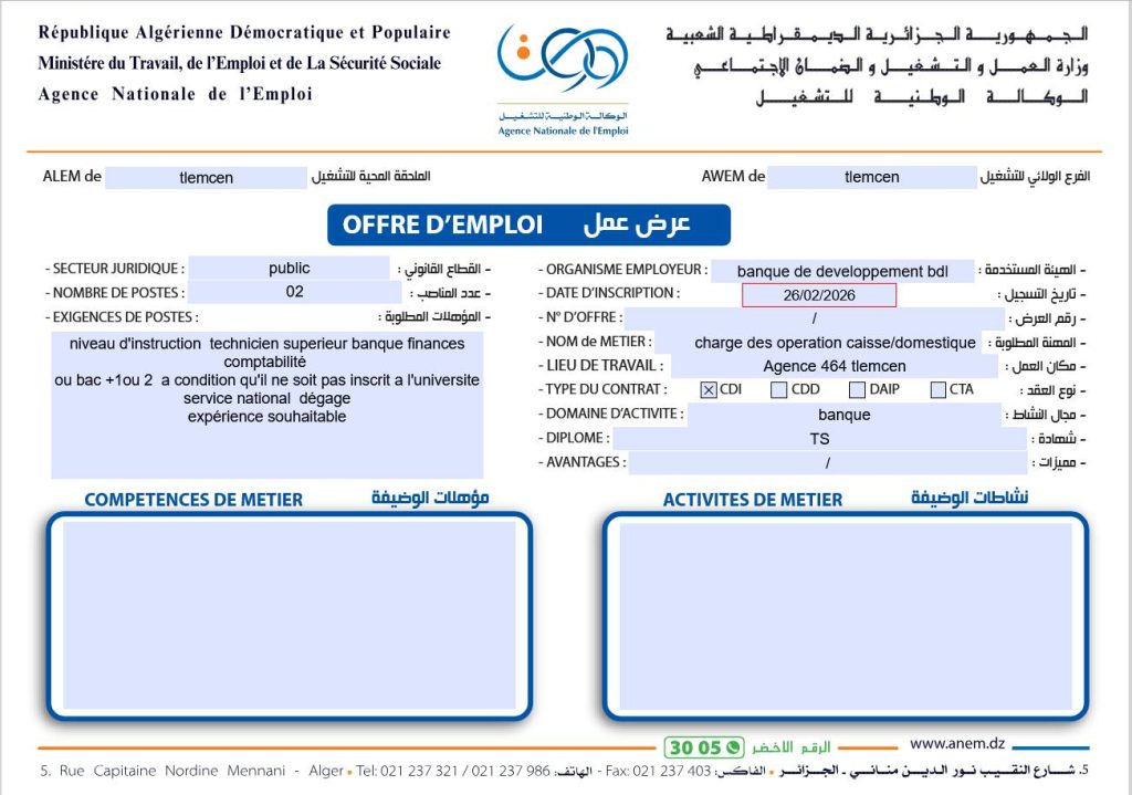 مكان العمل: وكالة 464 تلمسان