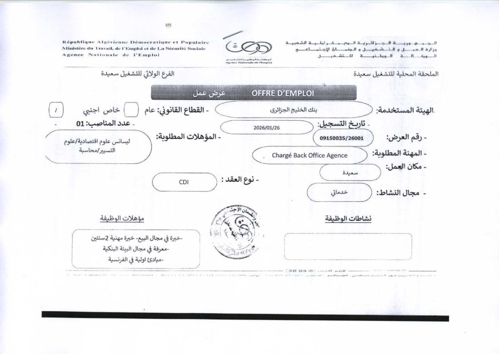 المهنة المطلوبة: Chargé Back Office Agence