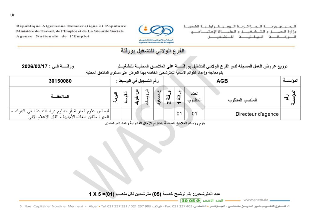 المنصب المطلوب: Directeur d’agence (مدير وكالة)