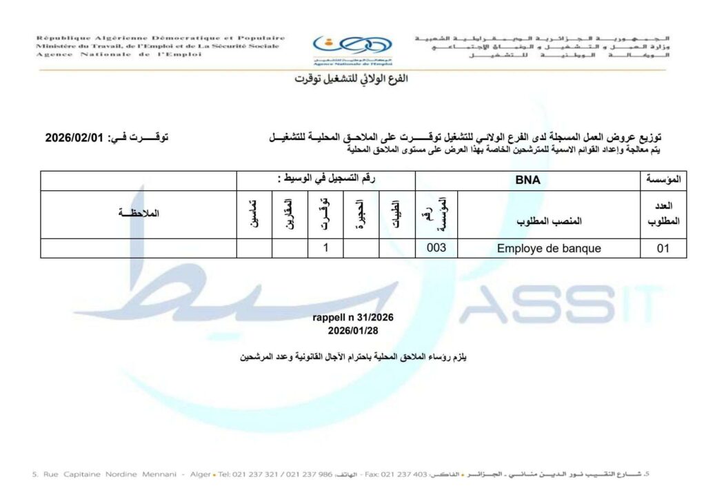 المنصب المطلوب:Employé de banque (موظف بنك)