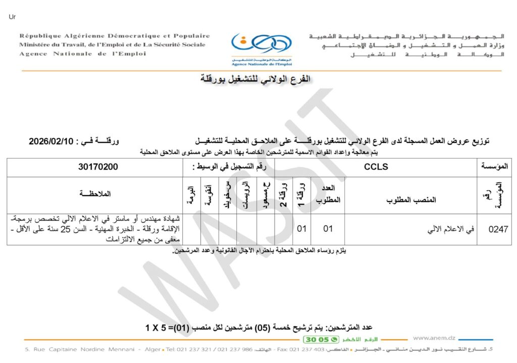 يعلن الفرع الولائي للتشغيل بورقلة عن توزيع عرض عمل مسجل على مستوى الملاحق المحلية للتشغيل، حيث يتم إعداد ومعالجة القوائم الاسمية للمترشحين عبر الملاحق المحلية المعنية.