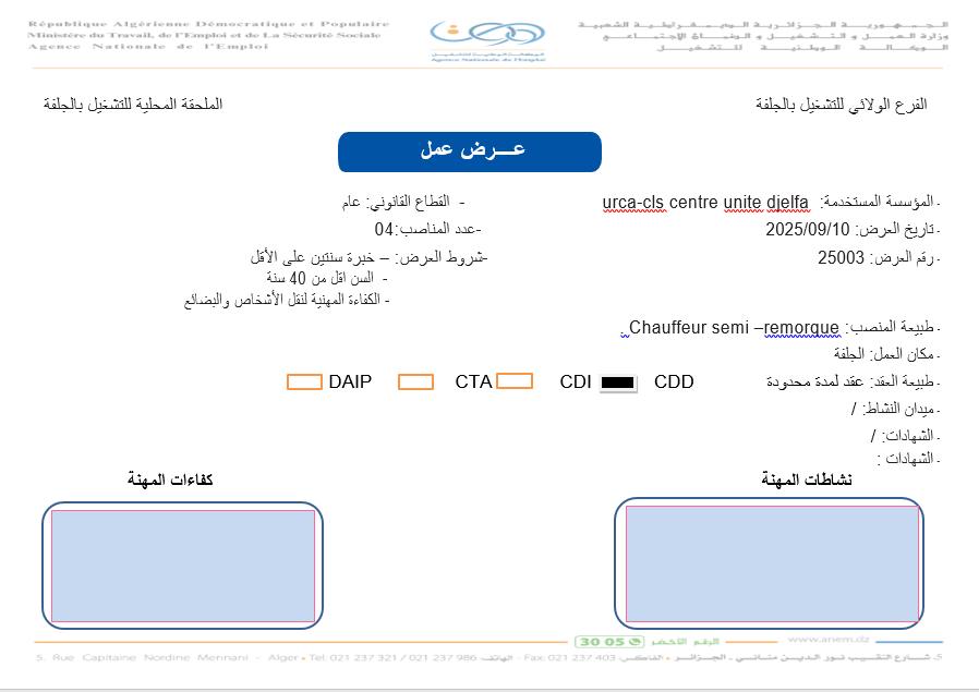 | Chauffeur semi-remorque (سائق نصف مقطورة) | 04 | الجلفة | عقد محدد المدة (CDD) | – خبرة مهنية سنتين على الأقل – السن أقل من 40 سنة – الكفاءة المهنية لنقل الأشخاص والبضائع |