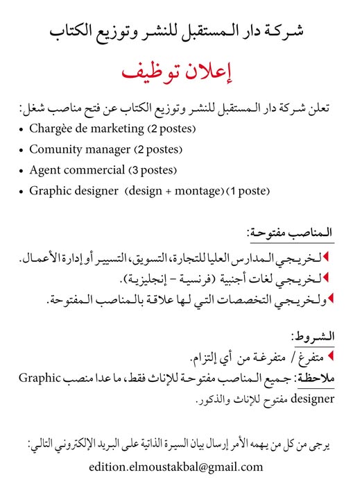 يرجى من كل من يهمه الأمر إرسال بيان السيرة الذاتية على البريد الإلكتروني التالي:edition.elmoustakbal@gmail.com