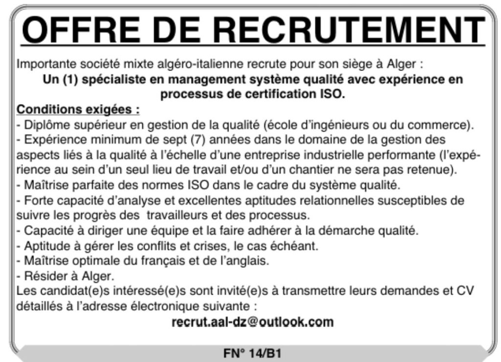 تعلن شركة مختلطة (جزائرية – إيطالية) كبرى عن توظيف