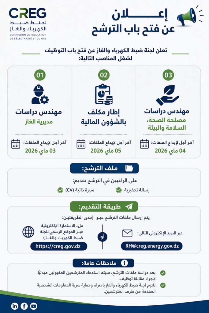 أو عبر البريد الإلكتروني التالي:RH@creg.energy.gov.dz