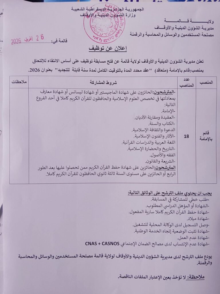 تعلن مديرية الشؤون الدينية والأوقاف لولاية قالمة عن فتح مسابقة توظيف على أساس الانتقاء لالتحاق بمنصب: قائم بالإمامة (متعاقد) “عقد محدد المدة بالتوقيت الكامل لمدة سنة قابلة للتجديد” بعنوان 2026.