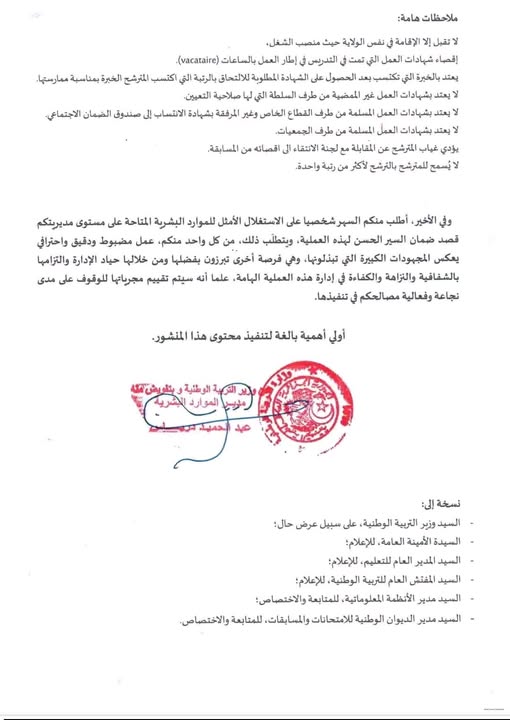 وفي الأخير، يُطلب من القائمين على العملية السهر شخصيًا على الاستغلال الأمثل للموارد البشرية المتاحة على مستوى مديرياتهم، قصد ضمان السير الحسن لهذه العملية. ويتطلب ذلك عملًا مضبوطًا، دقيقًا واحترافيًا يعكس المجهودات المبذولة، ويُبرز حياد الإدارة والتزامها بالشفافية، النزاهة والكفاءة في تسيير هذه المسابقة الهامة.