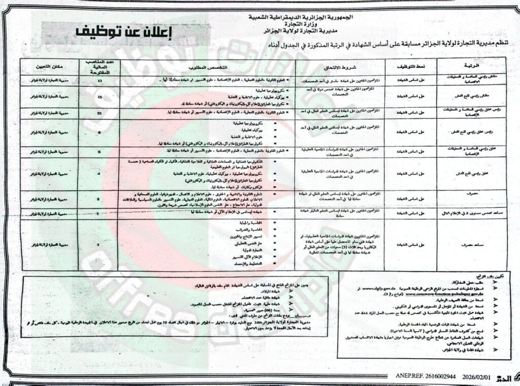 | مفتش رئيسي للمنافسة والتحقيقات الاقتصادية | على أساس الشهادة | شهادة ماستر في: العلوم التجارية، العلوم المالية، العلوم الاقتصادية، علوم التسيير. | 13 | مديرية التجارة لولاية الجزائر |