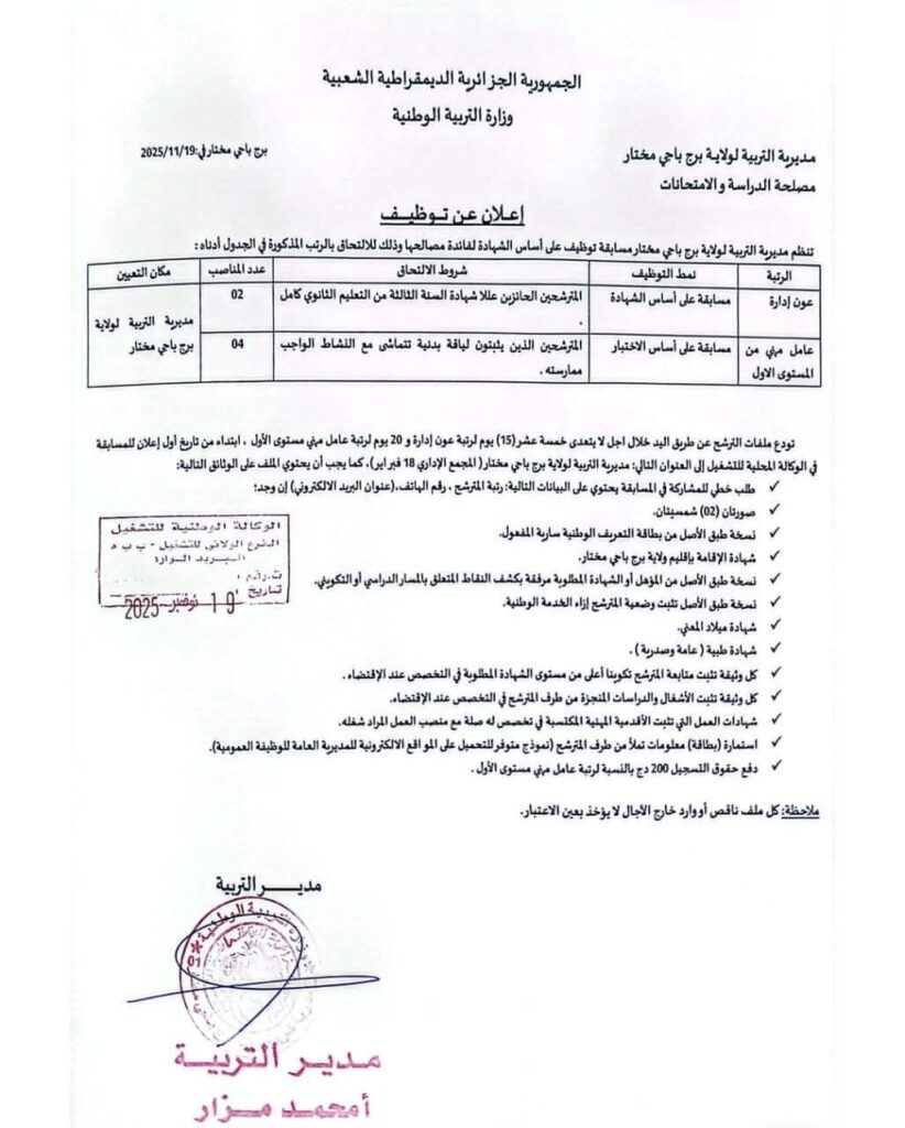تعلن مديرية التربية لولاية برج باجي مختار عن تنظيم مسابقة توظيف على أساس الشهادة لفائدة مصالحها، وذلك للالتحاق بالرتب التالية: