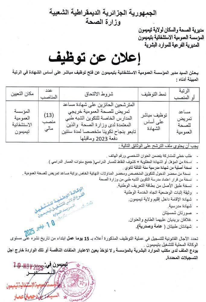 تعلن المؤسسة العمومية الاستشفائية بتيميمون، التابعة لمديرية الصحة والسكان لولاية تيميمون، عن فتح توظيف مباشر على أساس الشهادة في الرتبة المبينة أدناه:
