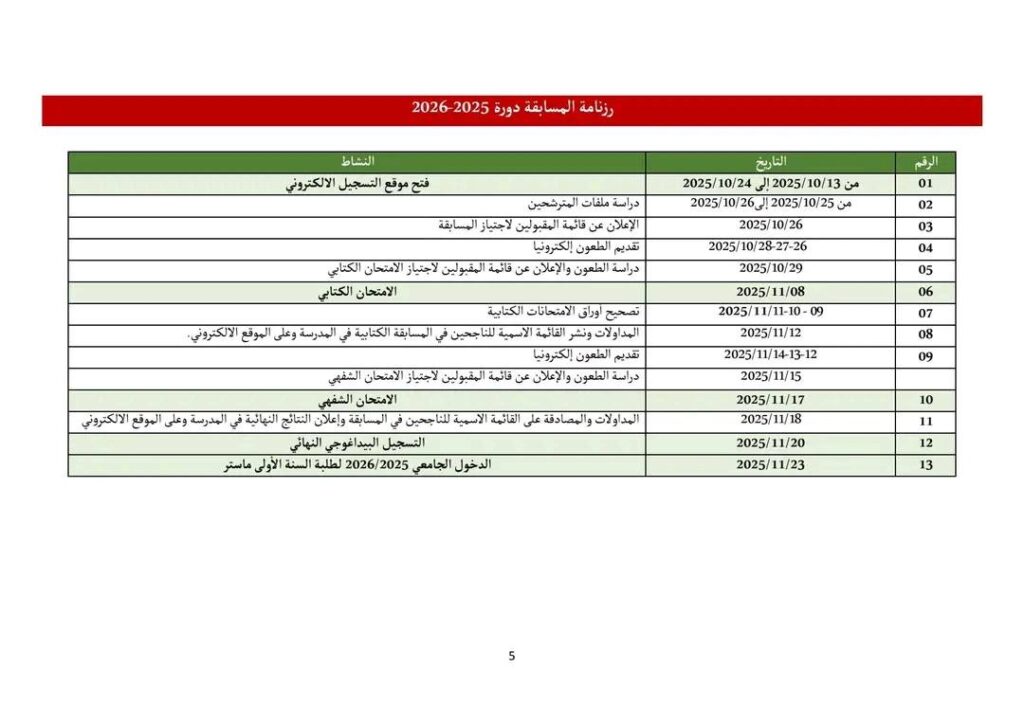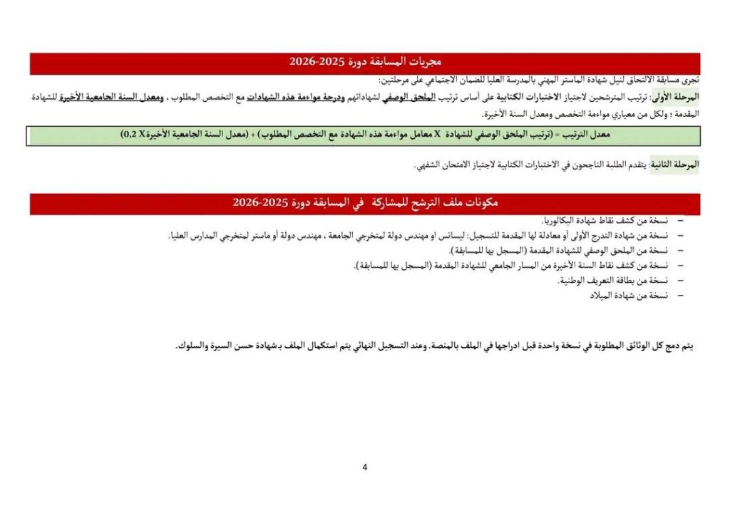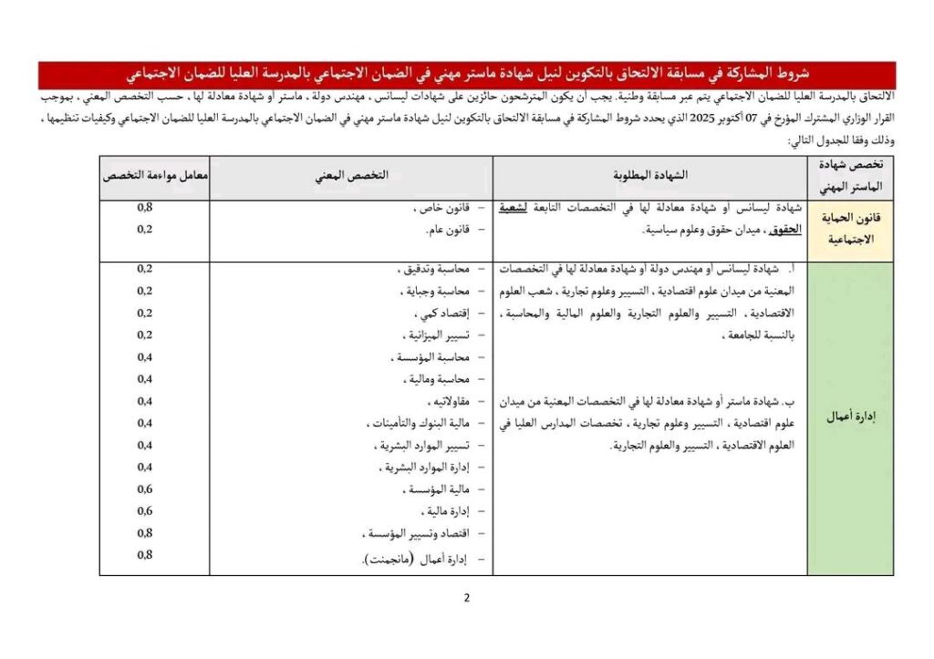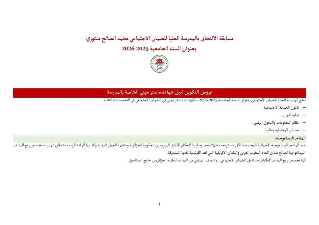 تعلن المدرسة العليا للضمان الاجتماعي عن فتح مسابقة وطنية للالتحاق بالتكوين لنيل شهادة الماستر المهني في الضمان الاجتماعي، وذلك وفقًا لأحكام القرار الوزاري المشترك المؤرخ في 07 أكتوبر 2025، الذي يحدد شروط المشاركة وكيفيات تنظيم المسابقة.