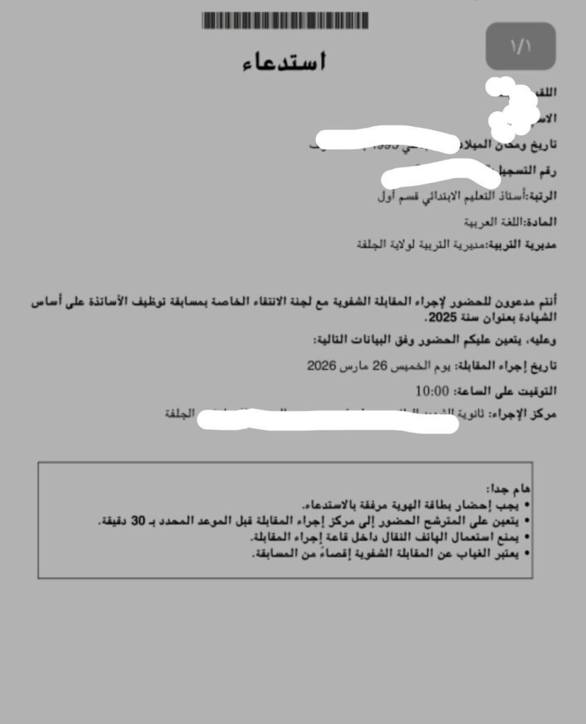 تفاصيل المقابلة: أنتم مدعوون للحضور لإجراء المقابلة الشفوية مع لجنة الانتقاء الخاصة بمسابقة توظيف الأساتذة على أساس الشهادة بعنوان سنة 2025. وعليه، يتعين عليكم الحضور وفق البيانات التالية: