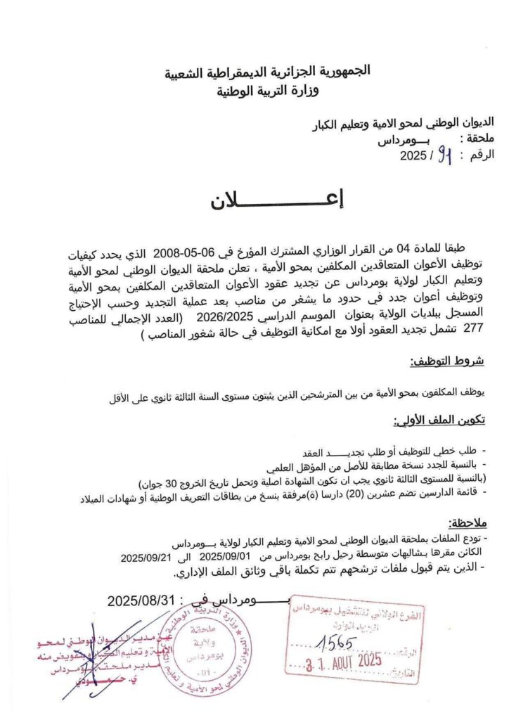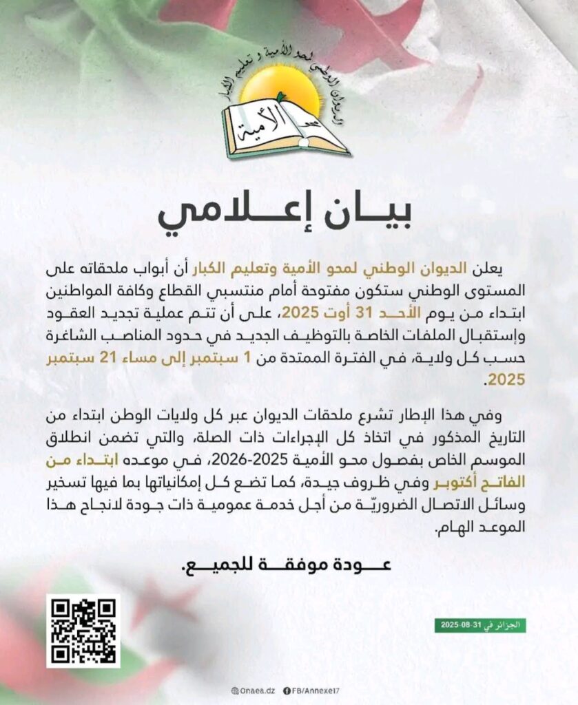 يُعلم الديوان الوطني لمحو الأمية وتعليم الكبار كافة منتسبي القطاع والمواطنين أن ملحقاته عبر الوطن ستكون مفتوحة ابتداءً من يوم الأحد 31 أوت 2025.