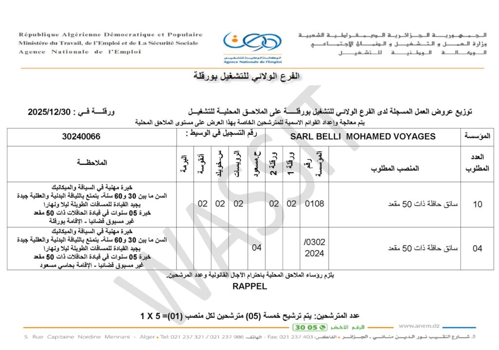 يعلن الفرع الولائي للتشغيل بورقلة عن توزيع عروض العمل المسجلة على مستوى الملاحق المحلية للتشغيل.