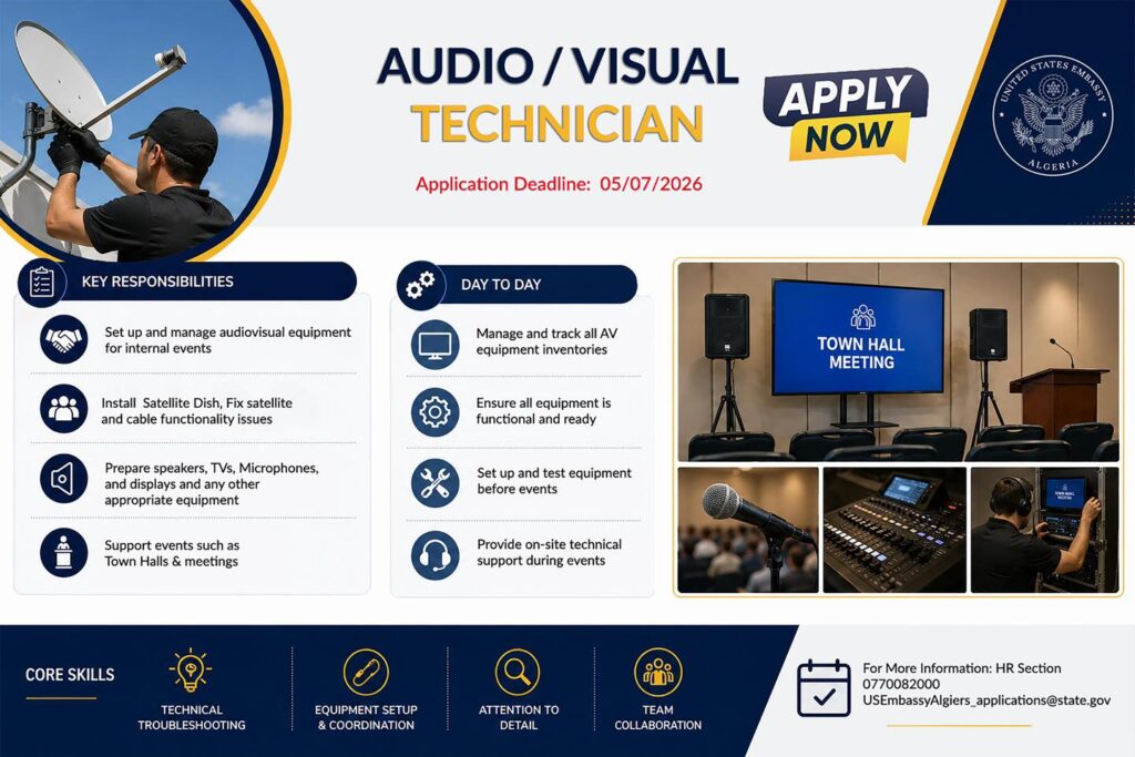The U.S. Embassy is recruiting an Audio/Visual Technician to support internal events and daily operations. This role helps ensure smooth event setup and reliable technical support across the Embassy.