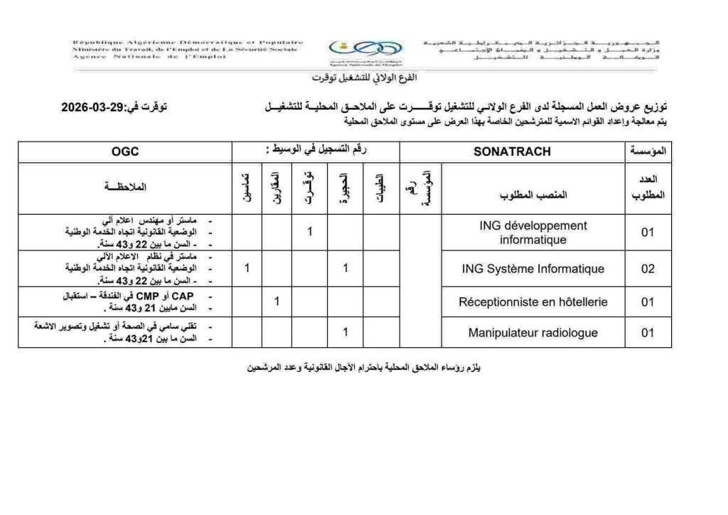 | SONATRACH | ING développement informatique | 01 | توقرت: 1 | – ماستر أو مهندس إعلام آلي – الوضعية القانونية اتجاه الخدمة الوطنية – السن ما بين 22 و43 سنة. |