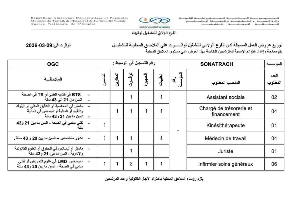| SONATRACH | Chargé de trésorerie et financement | 04 | المقارين: 1 توقرت: 1 الحجيرة: 1 الطيبات: 1 |
