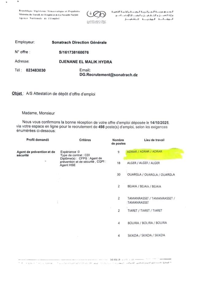 تؤكد المديرية العامة لسوناطراك استلام عرض العمل المودع بتاريخ 14/10/2025 عبر الفضاء الإلكتروني، والمتعلق بتوظيف 498 منصبًا موزعة عبر عدة ولايات، وفقًا للتخصصات والشروط المحددة أدناه: