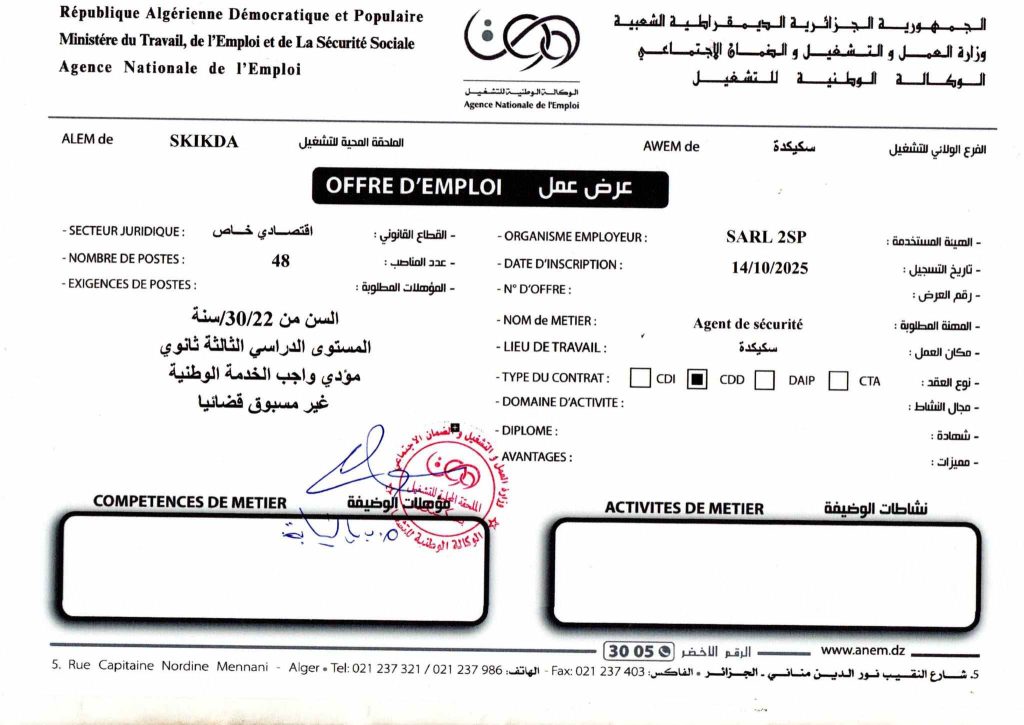 شركة أمن وحماية المنشآت الصناعية 2SP تفتح باب توظيف اعوان امن (91 منصب)