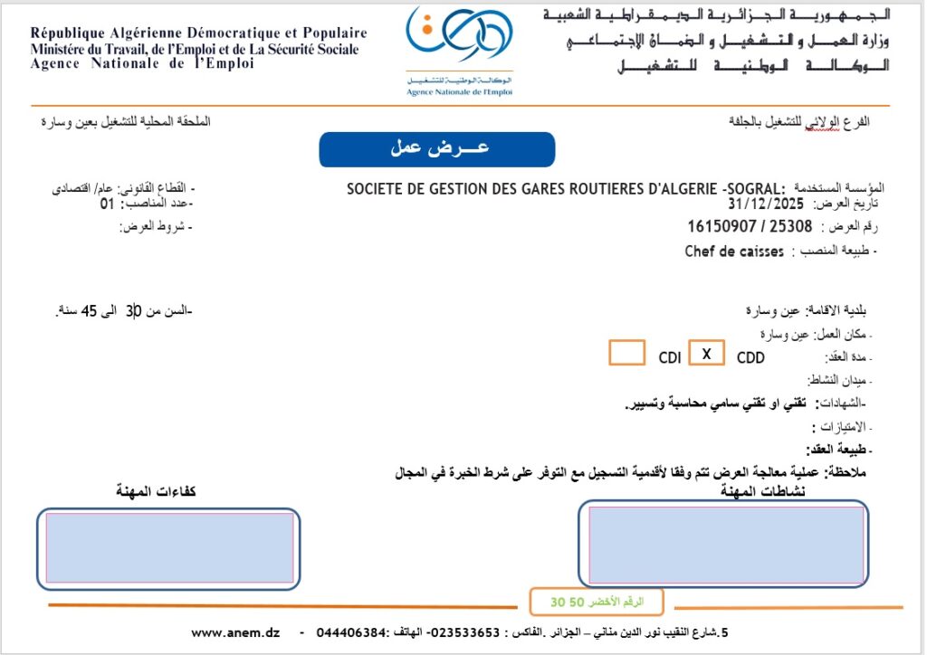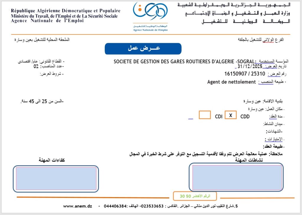 المؤسسة المستخدمة: SOCIETE DE GESTION DES GARES ROUTIERES D’ALGERIE – SOGRAL.