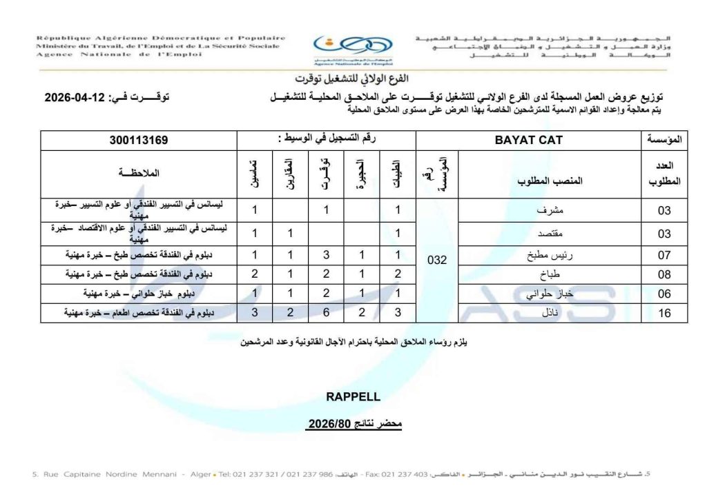 إعلانات توظيف صادرة عن الوكالة الوطنية للتشغيل (ANEM) – الفرع الولائي للتشغيل توقرت، لصالح مؤسسة BAYAT CAT.