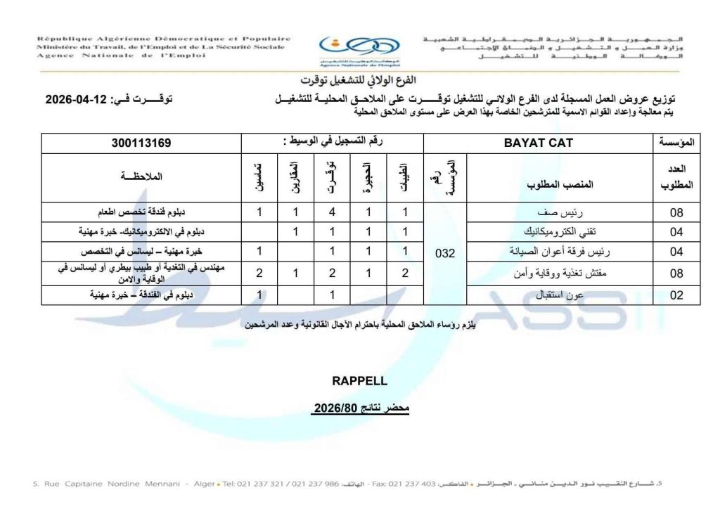 إعلانات توظيف صادرة عن الوكالة الوطنية للتشغيل (ANEM) – الفرع الولائي للتشغيل توقرت، لصالح مؤسسة BAYAT CAT.