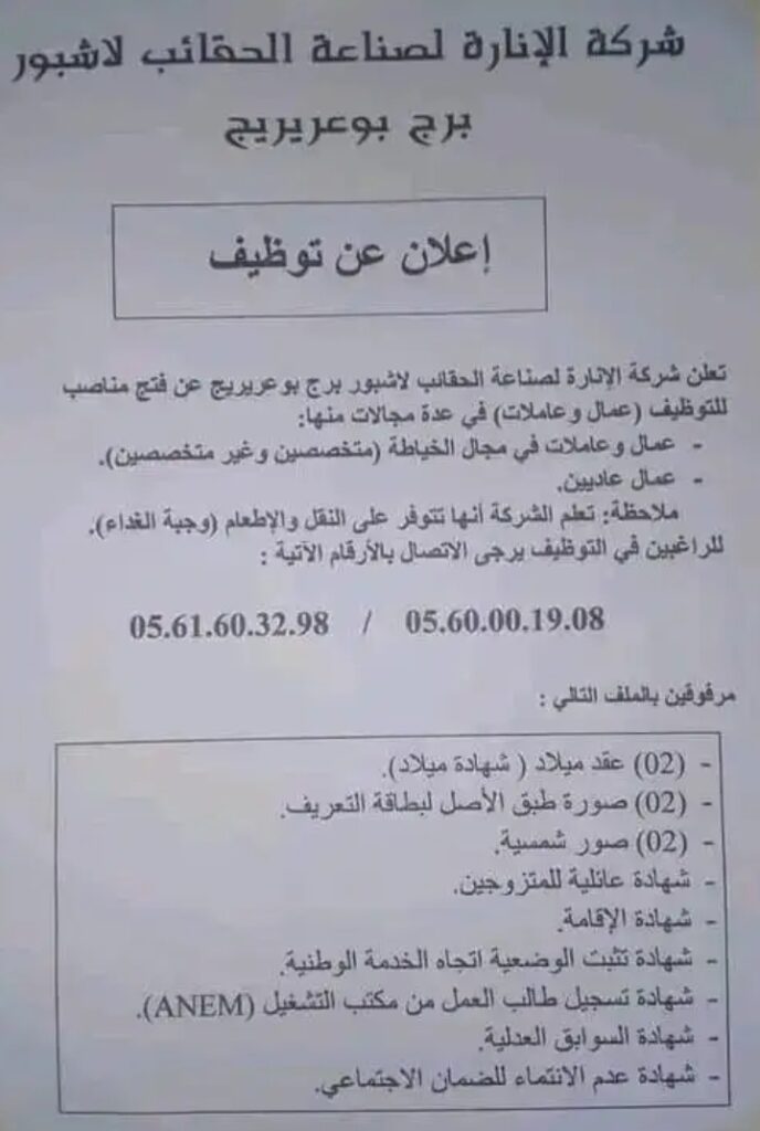تعلن شركة الانارة لصناعة الحقائب لاشبور برج بوعريريج عنح فتح مناصب للتوظيف عمال وعاملات