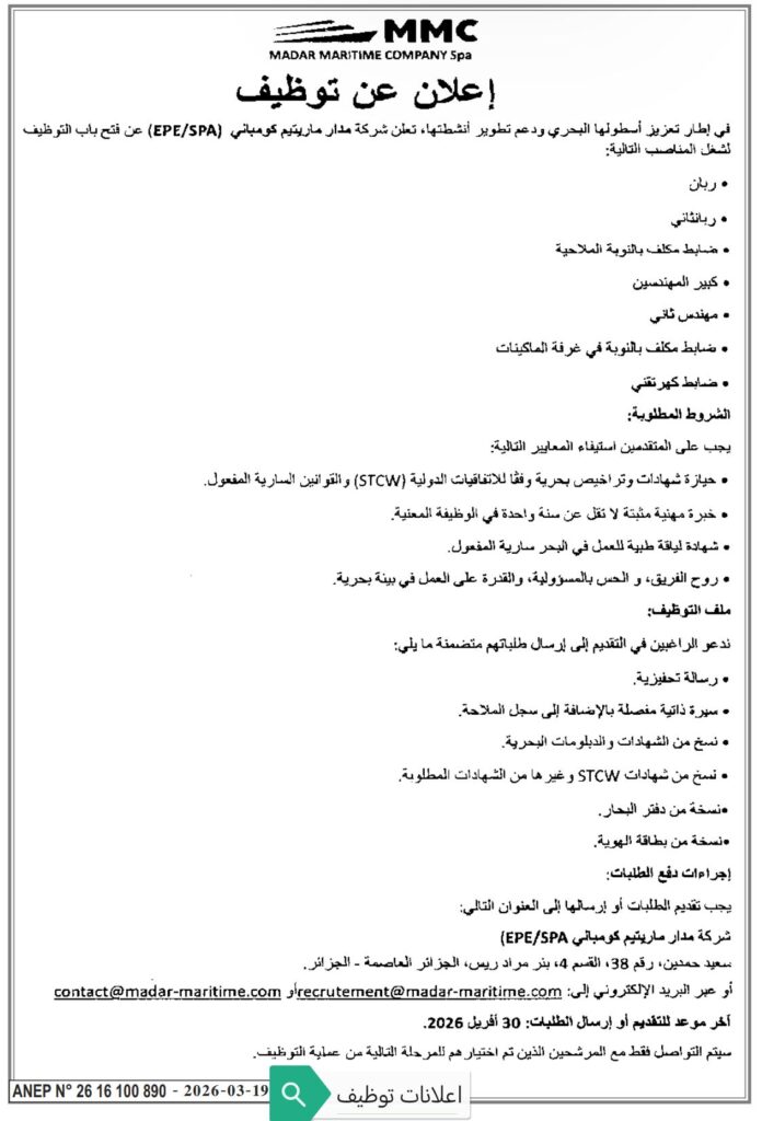 في إطار تعزيز أسطولها البحري ودعم تطوير أنشطتها، تعلن شركة مدار ماريتيم كومباني (EPE/SPA) عن فتح باب التوظيف