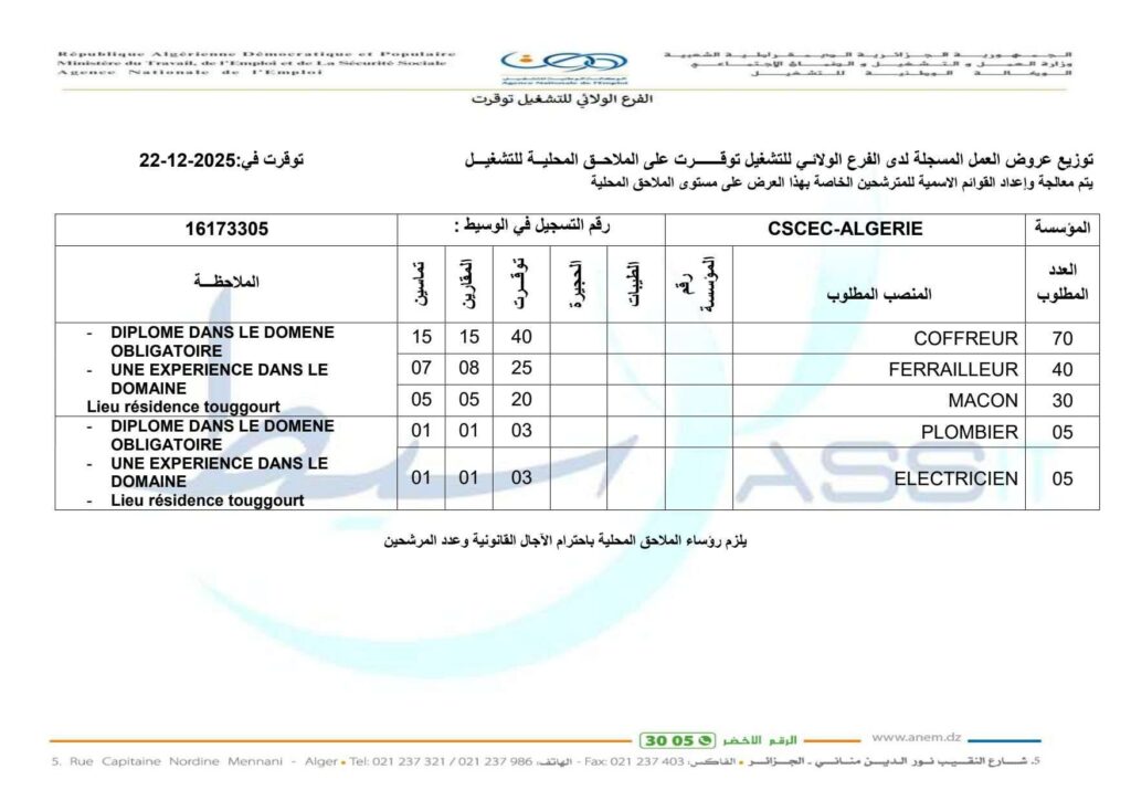 يتم معالجة عرض العمل آليًا عن طريق النظام المعلوماتي “وسيط” بالملحقات المحلية للتشغيل في توقرت.