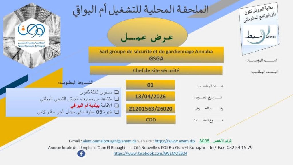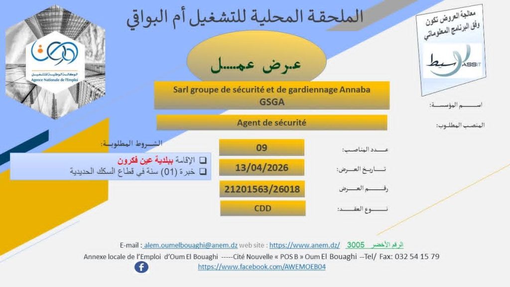 اسم المؤسسة: Sarl groupe de sécurité et de gardiennage Annaba GSGA