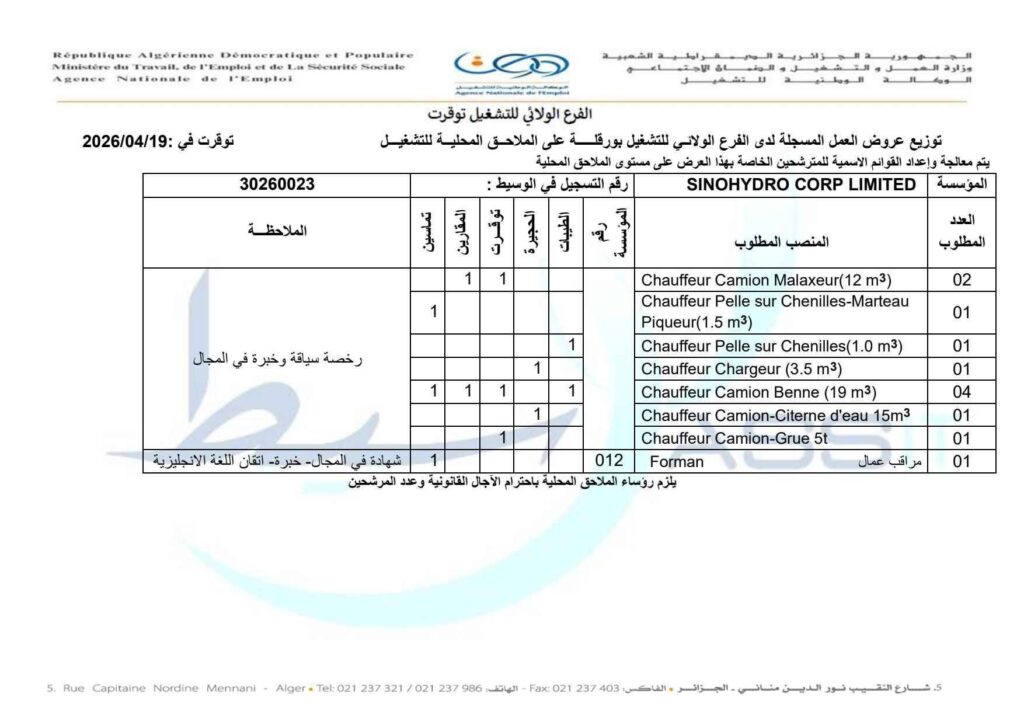 | Chauffeur Pelle sur Chenilles ( | 01 | رخصة سياقة وخبرة في المجال |