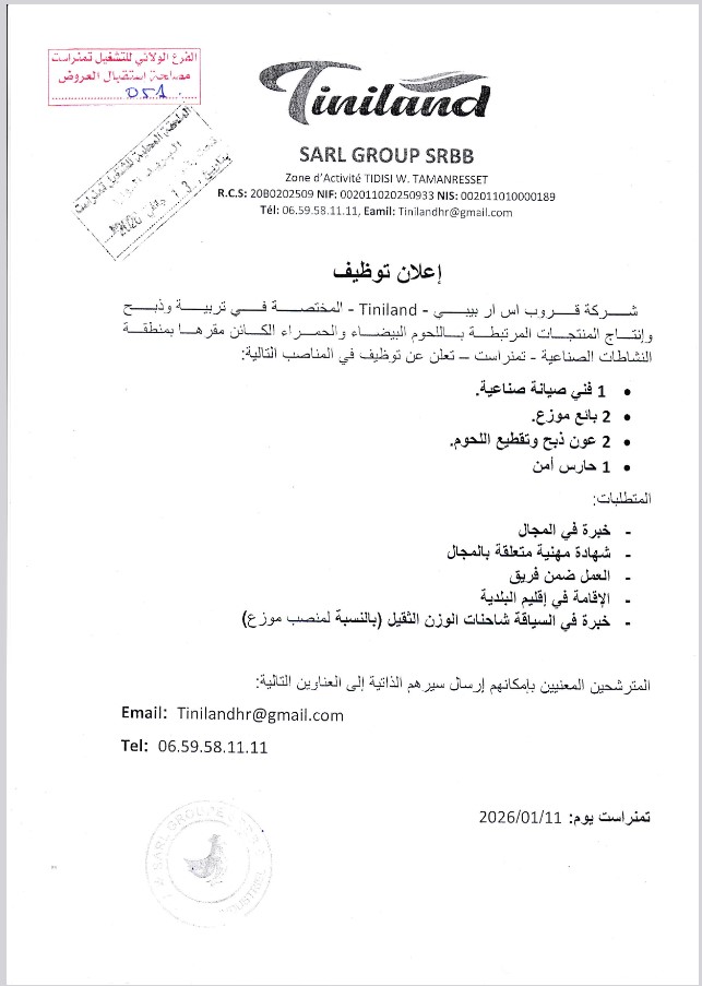 تعلن شركة قروب اس ار بيبي – Tiniland – المختصة في تربية وذبح وإنتاج المنتجات المرتبطة باللحوم البيضاء والحمراء الكائن مقرها بمنطقة النشاطات الصناعية – تمنراست – تعلن عن توظيف في المناصب التالية: