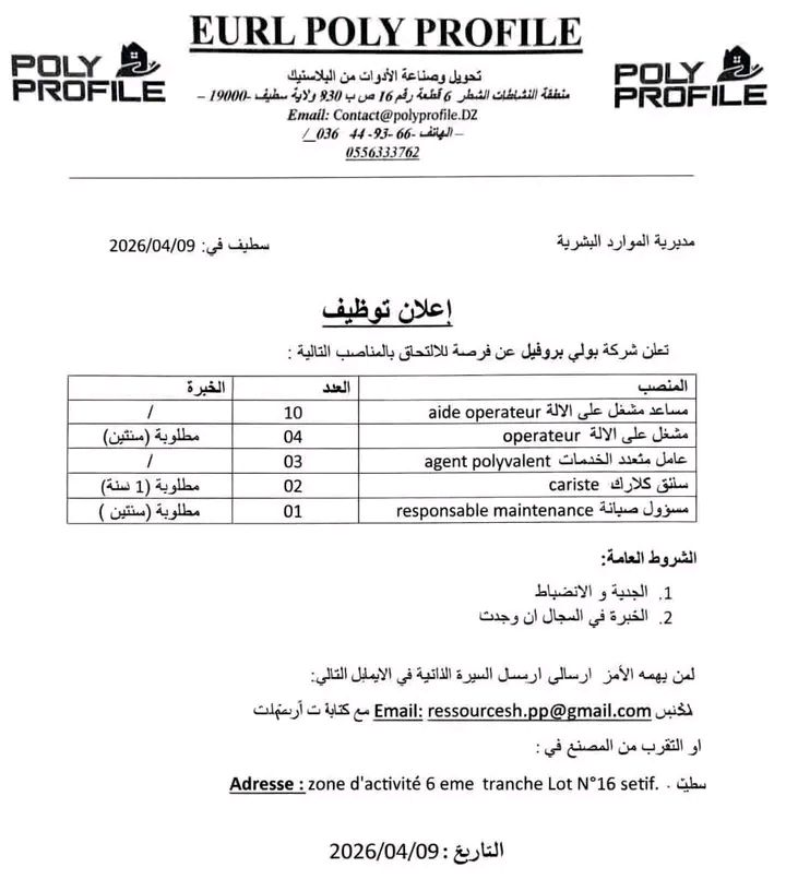 شركة بولي بروفيل تعلن عن وظائف شاغرة لعمال في صناعة الأدوات البلاستيكية
